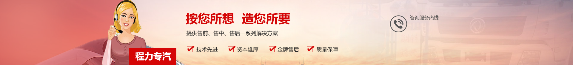 程力專用汽車股份有限公司銷售二十七分公司是定點生產各類專用汽車的專業廠家,大型專用汽車制造廠。國內園林綠化、石油化工、市政環衛、壓力容器專用汽車制造商。注冊商標“程力威”牌,國家產品代碼:“CLW”。東風、解放公司的重要合作伙伴,主要從事各類專用汽車的生產制造業務,同時也銷售各大型廠家的整車及配件。公司擁有自行出口權,產品占據大量國外市場,其主導品種有灑水車、油罐車、垃圾車、吸糞車、吸污車、自卸車、廂式貨車、半掛車、清障車、隨車吊、高空作業車、教練車、散裝水泥車、化工車、消防車、汽車配件、水泥攪拌車、牽引車等八大系列100多個品種車型。同時批發東風、解放、楚風各種二類底盤。